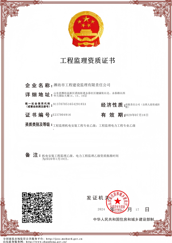 企業(yè)資質 當前位置:首頁 · 關于我們 · 企業(yè)資質 營業(yè)執(zhí)照(三合一) 工程監(jiān)理資質證書 工程監(jiān)理資質證書 人防監(jiān)理乙級資質 工程招標代理機構資質證書 工程咨詢資質證書 職業(yè)健康安全管理體系認證證書 環(huán)境管理體系認證證書 質量管理體系認證證書